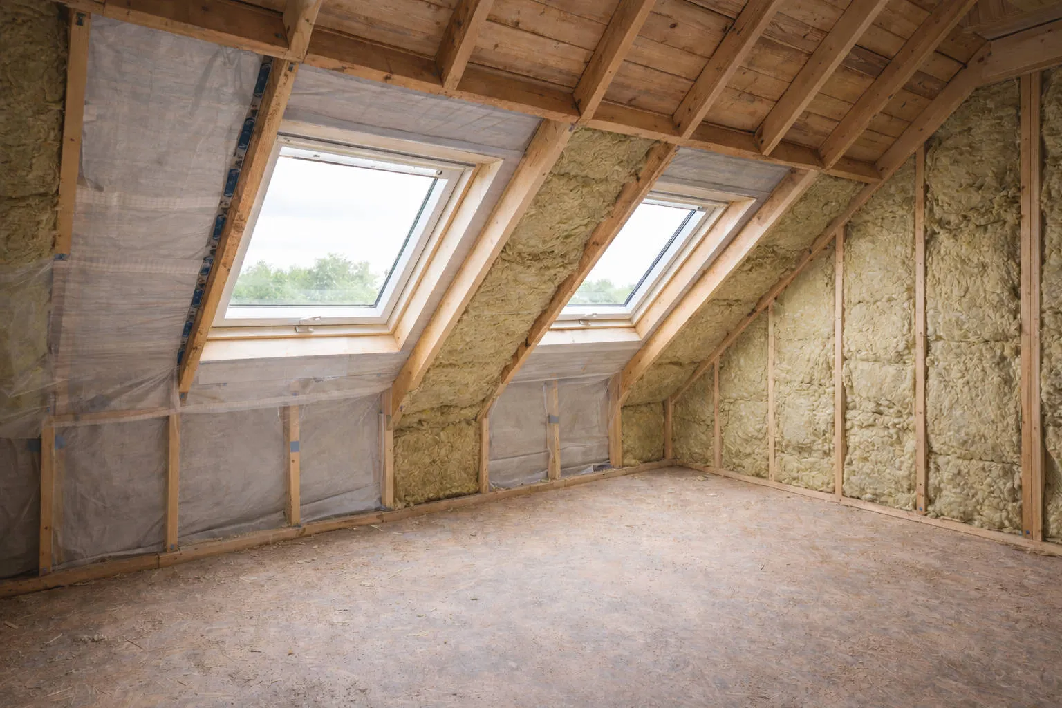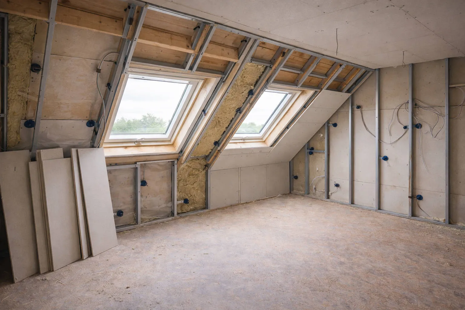 Kompletter Dachausbau mit Dämmung, Trockenbau, Boden und Elektro-Vorbereitung.
